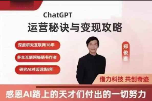 本套课程ChatGPT运营秘诀与变现攻略,ChatGPT使用方法与技巧,本课程由郑俊雅老师主讲,共100讲完整版。很多人只是听说ChatGPT很强大,但是真正等到自己动手用的时候一脸茫然,不知道该怎么高效使用它;本次更新的课程从零教大家如何使用ChatGPT以及如何给ChatGPT下指令等,并通过具体的实际案例教大家如何使用ChatGPT。